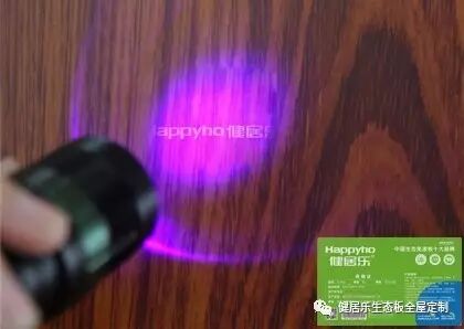 其实健居乐生态板用紫外线鉴定的方法和我们验证人民币的真伪是有异曲同工之妙的。用紫外线照射板面,会出现健居乐logo。