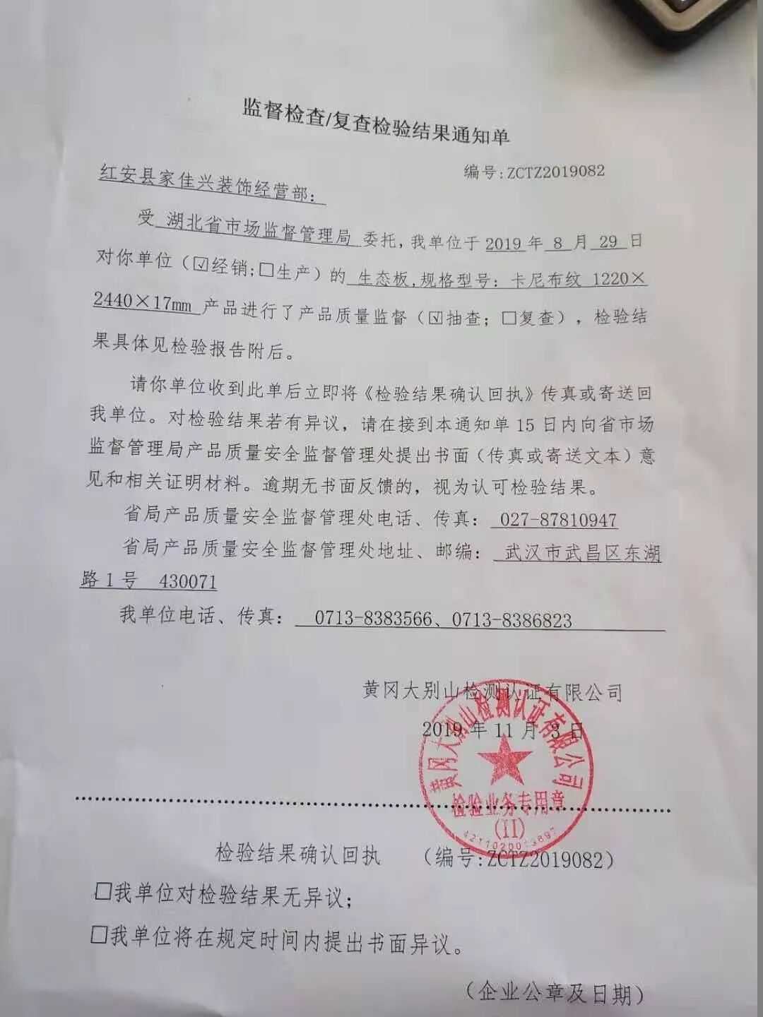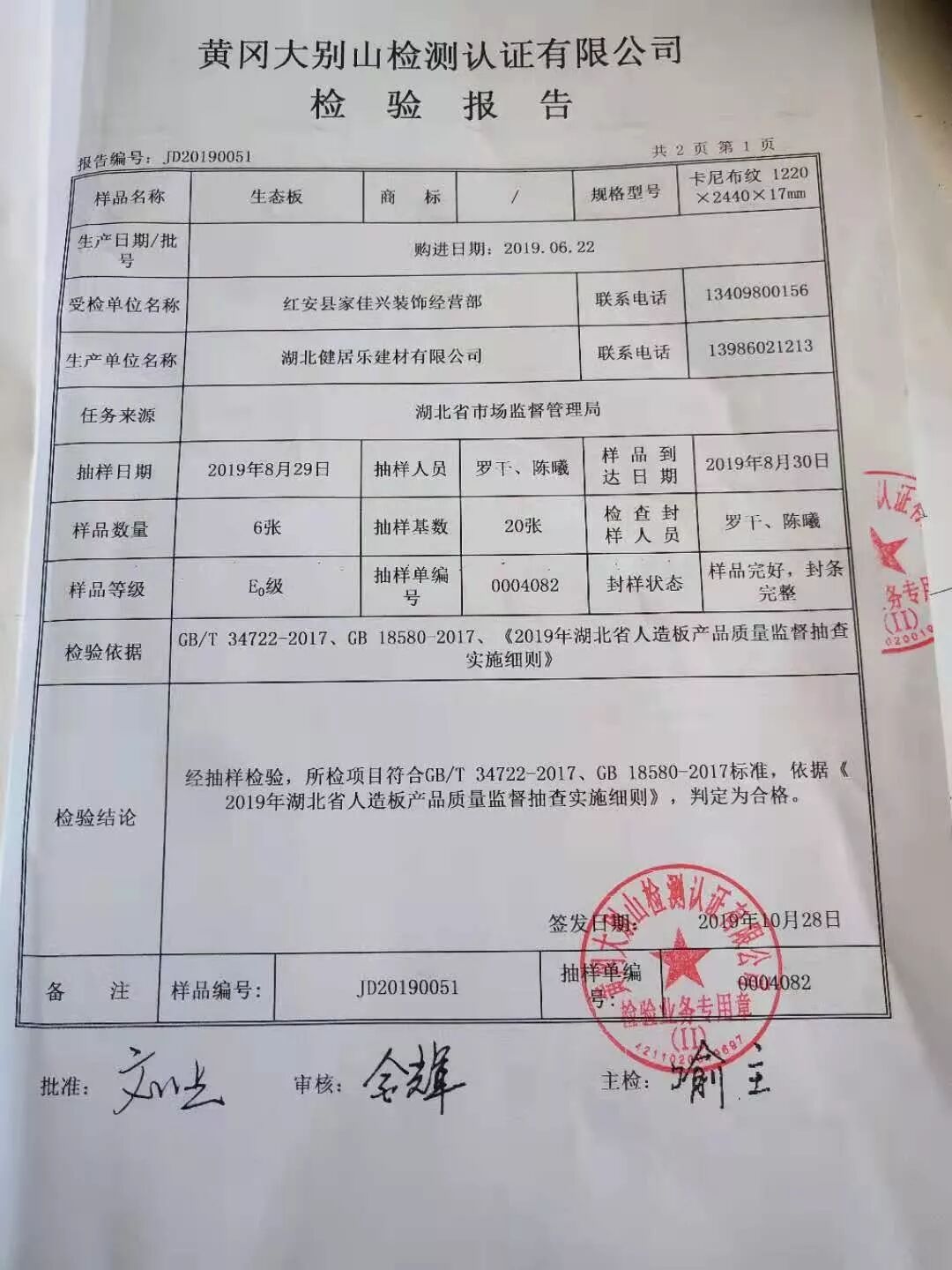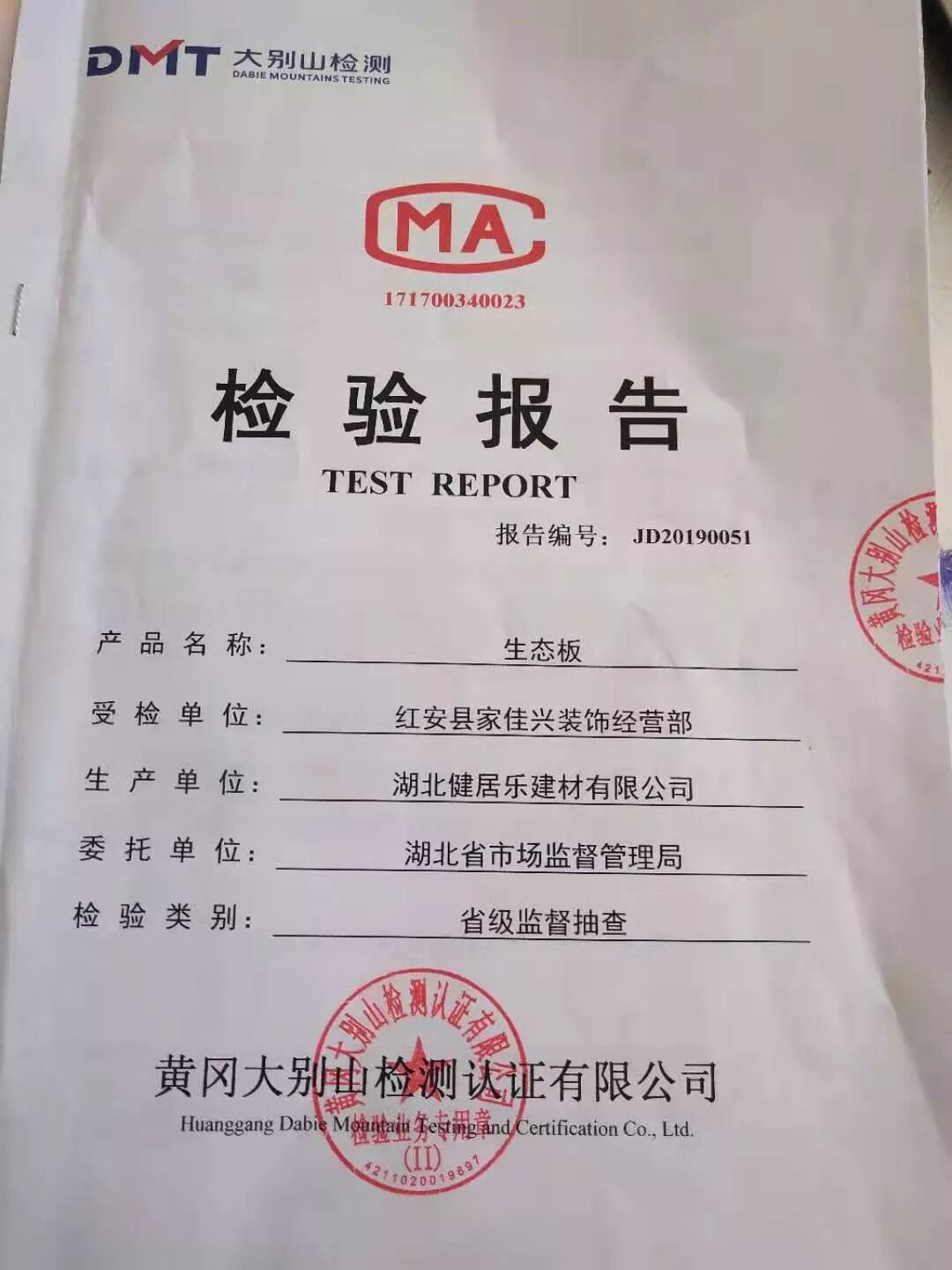2019年8月,红安建材市场进行了一次产品质量抽检行动,健居乐生态板被列入了受检之列,于近日抽检结果出炉,被抽检的健居乐生态板产品各项指示全部合格,是本次市场抽检中为数不多的质量完全合格品牌。